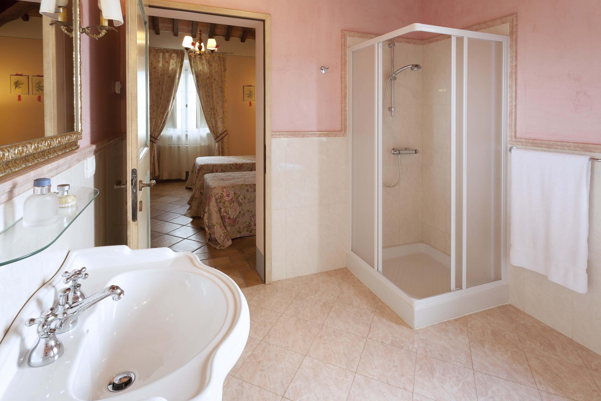 The agriturismo has 2 large and 3 small complete and attractively furnished apartments on the ground floor and as the crown jewel a detached cottage for 5 persons. The large apartments and the cottage have a private covered patio with lots of privacy. The small apartments have a cozy terrace with table and chairs, separated by a hedge of beautiful jasmine. The agriturismo has four elegant rooms and a suite, on the first floor of the country house. The rooms and the suite are colorful and very attractively furnished and equipped with fridge, wifi, telephone and satellite TV.